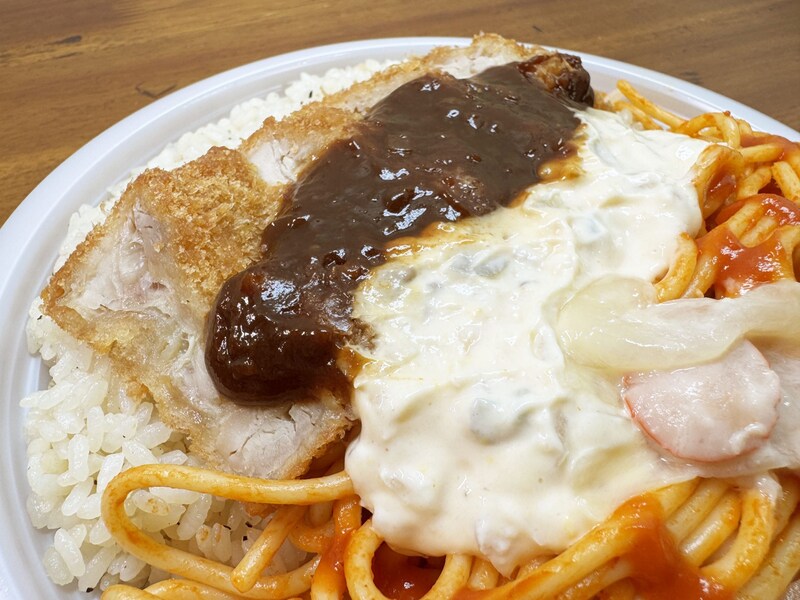 セブンイレブンで売っていた「デミタルチキンカツ&ナポリタン」。その中身が凄まじくご褒美だった。ピラフはピラフでもバターピラフ! そして濃厚トマトなナポリタン、超絶マッタリ爽やかなコクのタルタルソース、そして芳醇なデミグラスソース、そしてジューシーなチキンカツ! すべてがご褒美!