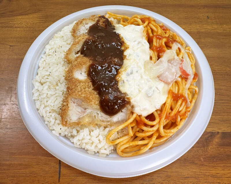 「チキンカツをメインに、バターピラフ,ナポリタン,タルタルソース,デミグラスソースを組み合わせたボリューム満点の大盛り弁当です」