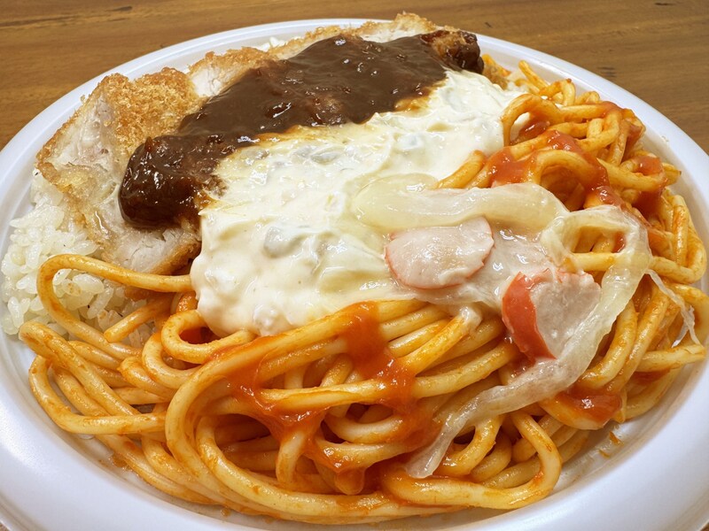 さっそく食べる。どこから食べればよいか迷うが、まずはナポリタンからズズッと食べるのが潔いだろう。アツアツに加熱したナポリタンは爽やかな薫りを放ちつつ、トマトの強いコクを楽しませてくれる。