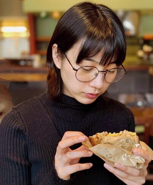 さらに、黒のリブニットに丸いフレームのメガネを合わせ、知的な雰囲気を漂わせながら、サンドウィッチを頬張る自然体の姿も公開。飾らない表情とシンプルな着こなしが、のんらしい魅力を引き立てている。