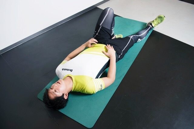 (2)腰をひねりながら立てた左ひざを内側に倒し、右手で左ひざを軽く押さえる