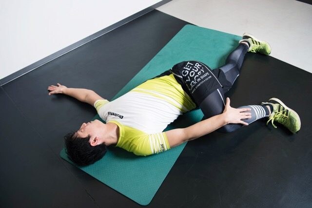 続けて反対方向も同様に実践します。なお、キープ時に倒した脚のひざが浮いてしまうと十分にお腹や背中、腰を伸ばすことができません。特にお腹周りの筋肉が固くなっている方はひざが浮いてしまいやすいので、実践中は「手でひざをしっかり押さえること」を心がけてくださいね。<ストレッチ監修:コシバフウタ(トレーナー歴3年)>