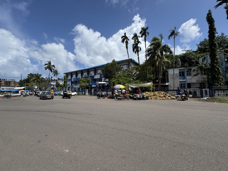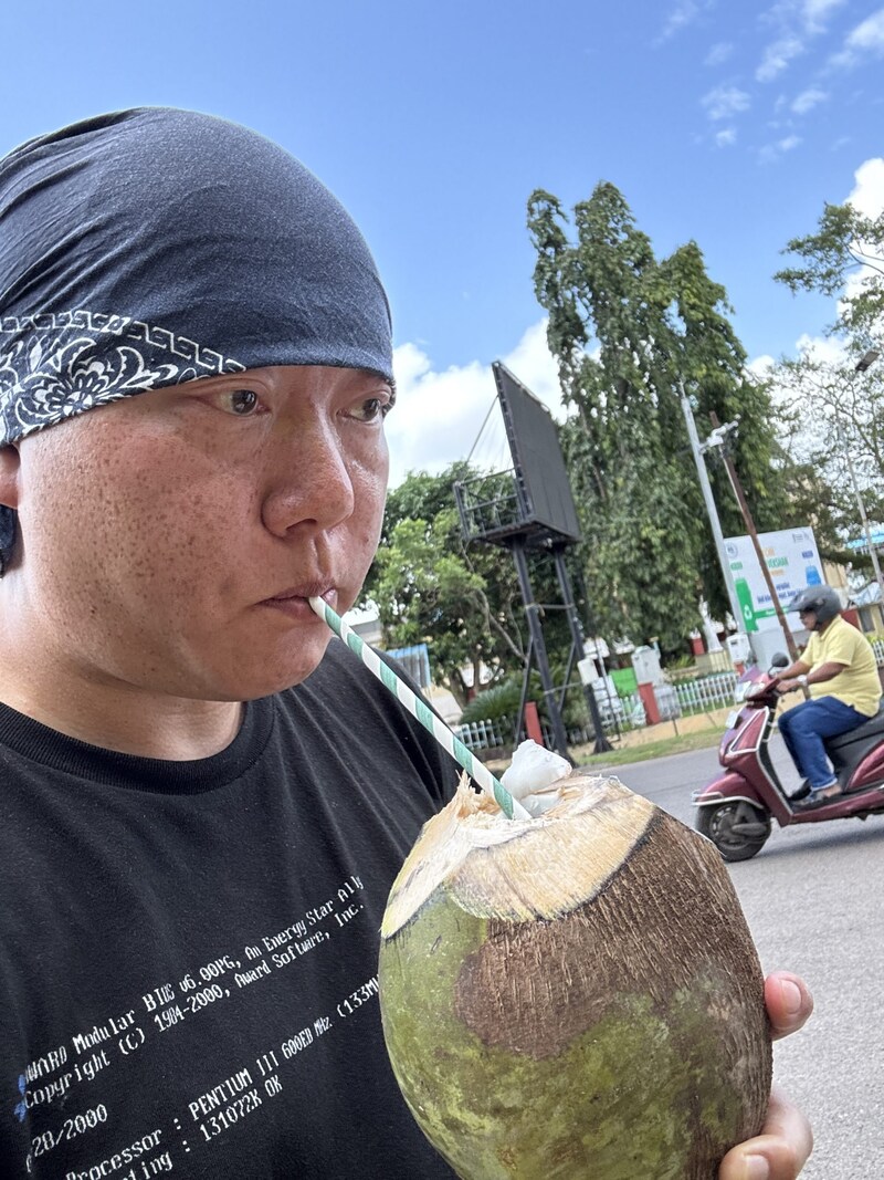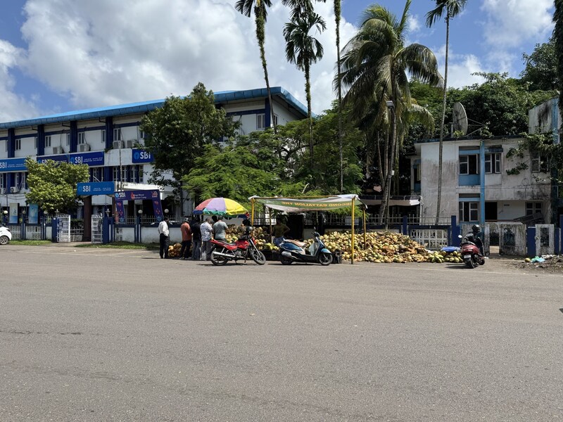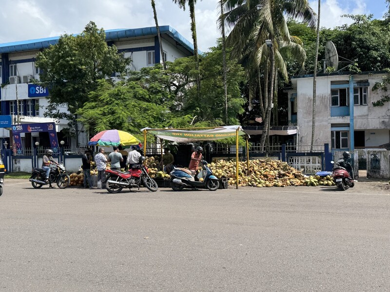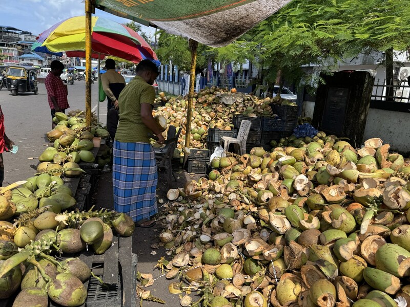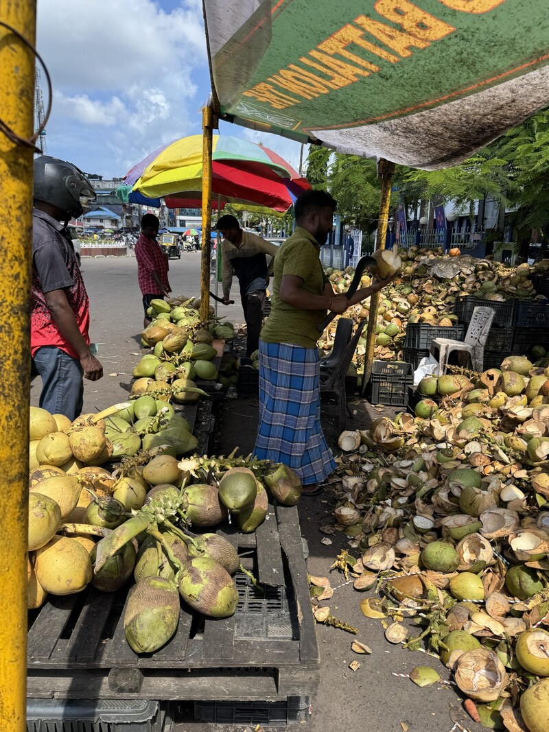 ここはインド・ポートブレアの路上。多種多様な露店がありますが、ひときわ目立つ存在が、ココナッツ屋。