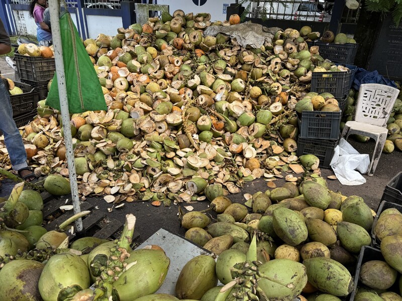 大量の新鮮なココナッツと、ココナッツの皮が山積みになっています。