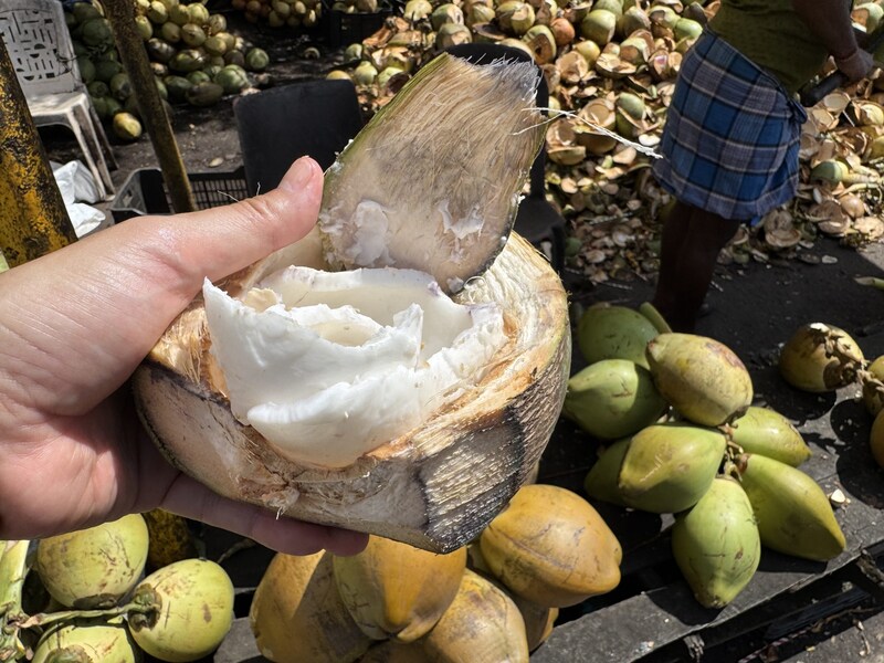 ジュースを飲んだら、また職人にココナッツを渡します。すると、今度はココナッツの硬い皮で、ココナッツの柔らかい果肉を削ってくれます。それを食べるのです。