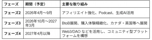 フェーズ2以降では、Podcast 配信や BtoB 展開を通じて収益源の多様化を図り、北米市場での拡大を見据えた新たな事業の柱として成長を目指します。