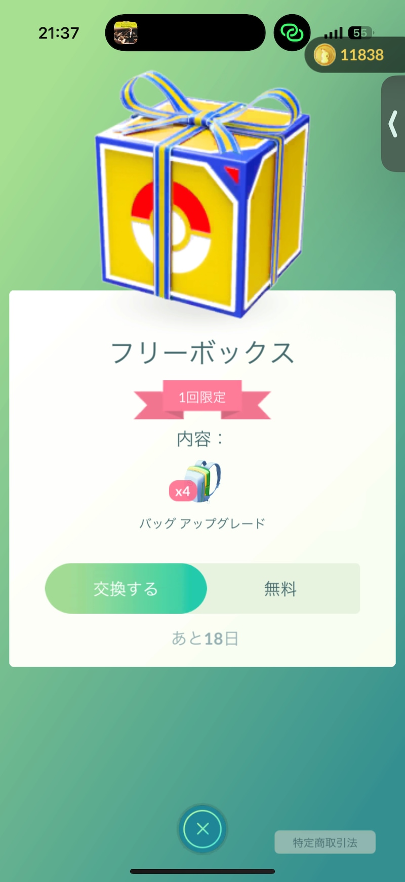 ▲「交換する」で、バッグアップグレード4回分を受け取れます。