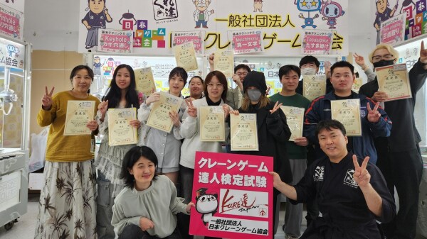 「クレーンゲーム達人検定(くれ達)」は、日本クレーンゲーム協会が主催する日本初の技能検定で、3級・2級・1級の3段階があります。初心者から上級者まで挑戦できる仕組みで、定期的に行う一般検定のほか、外国人観光客向けや、こどもの日・県民の日などに小学生以下の子供や地元住民を対象とした特別検定も実施しています。