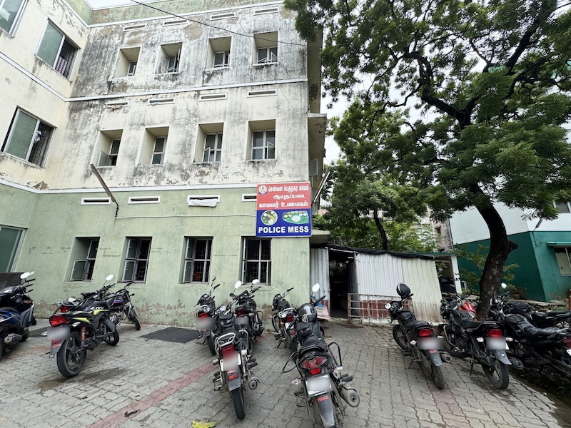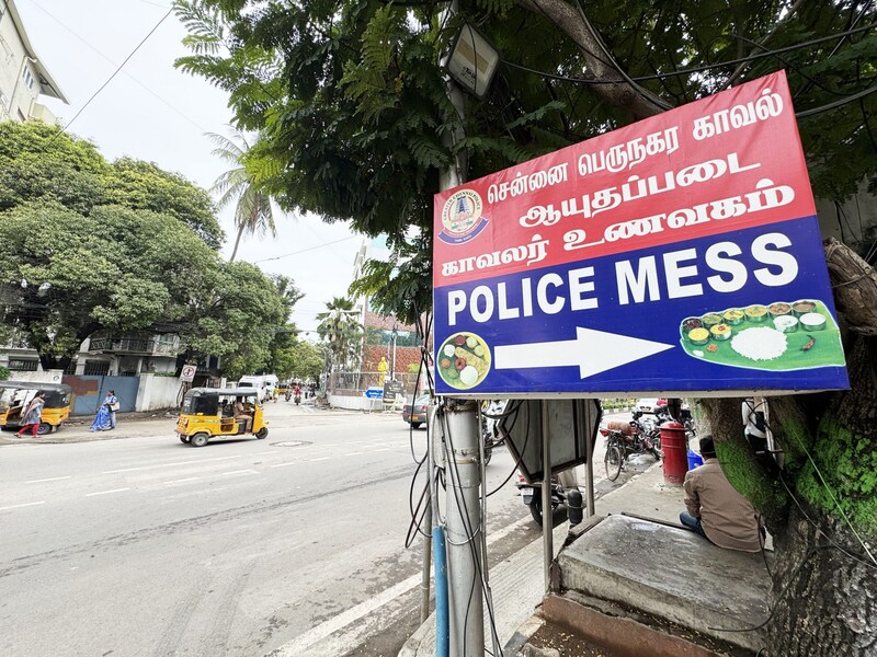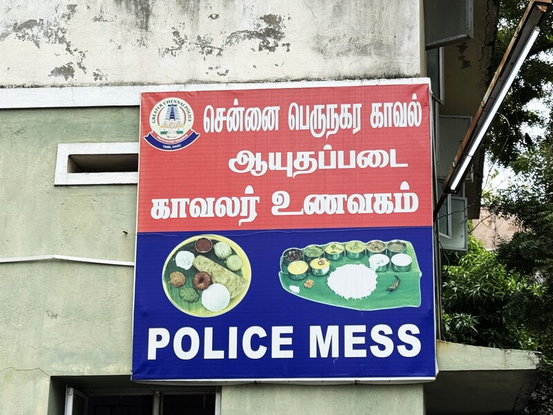 ポリス食堂はチェンナイ警察本部の敷地内にあります。敷地内には警察官の寮があり、警察官だけでなく、その家族も住んでいます。警察署の入口に行くと、大きく「POLICE MESS」と書かれた看板がありました。確かに存在した、ポリス食堂。