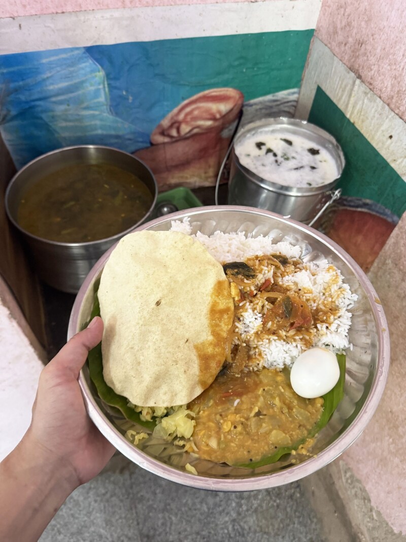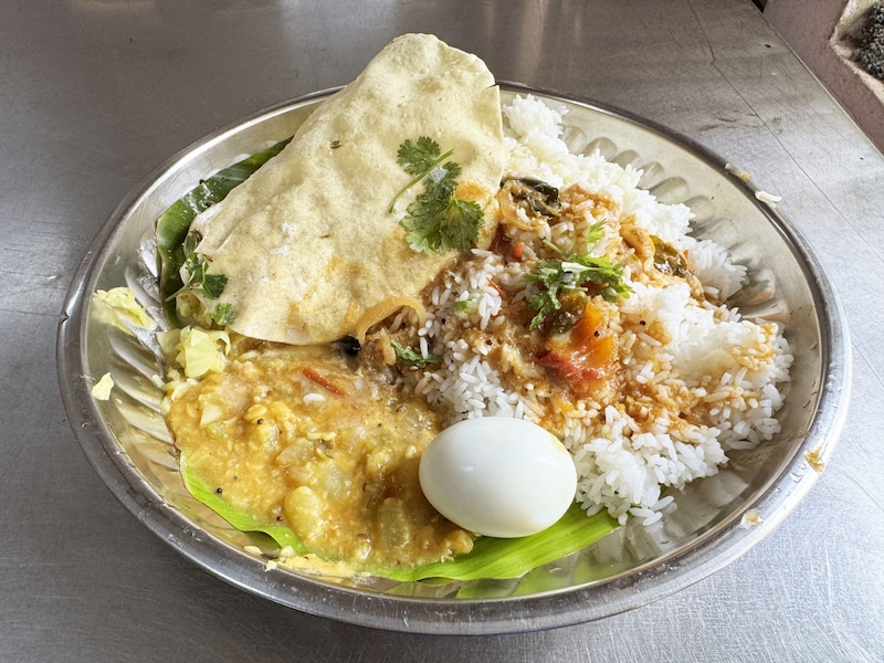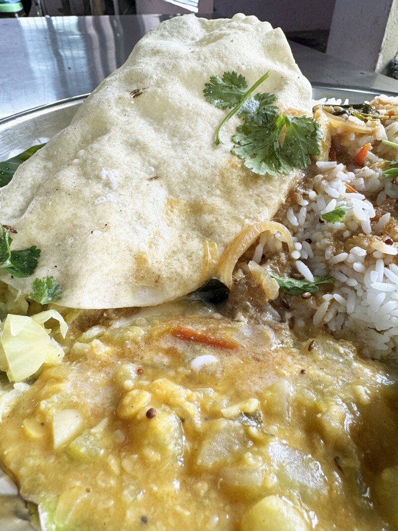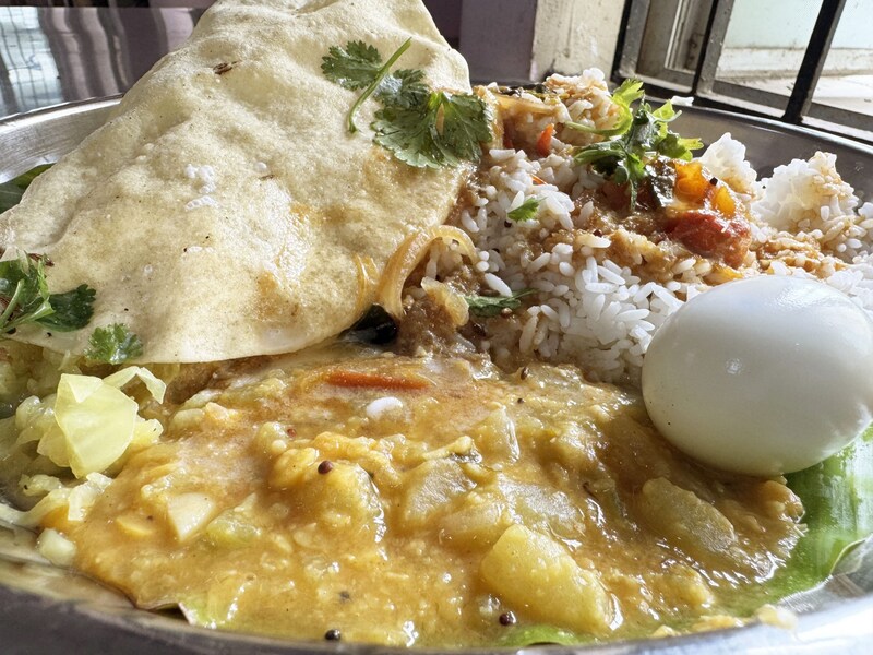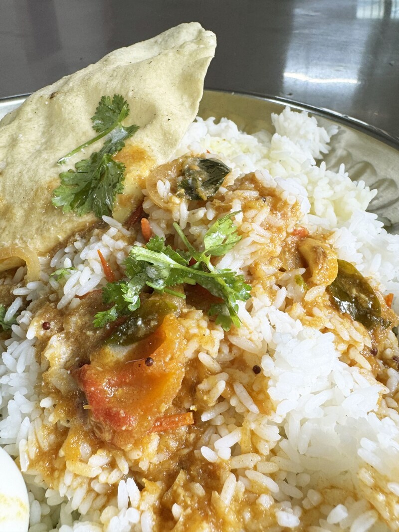 まずはじめに、ライスと根菜カレー、漬物、パパド(インド式せんべい)、ゆで卵が盛られた皿を渡されます。あとは自分でスープ(サンバル)やヨーグルトをお好みでかけます。筆者はかけまくりました。