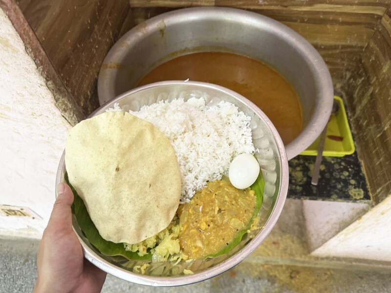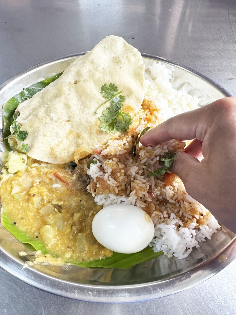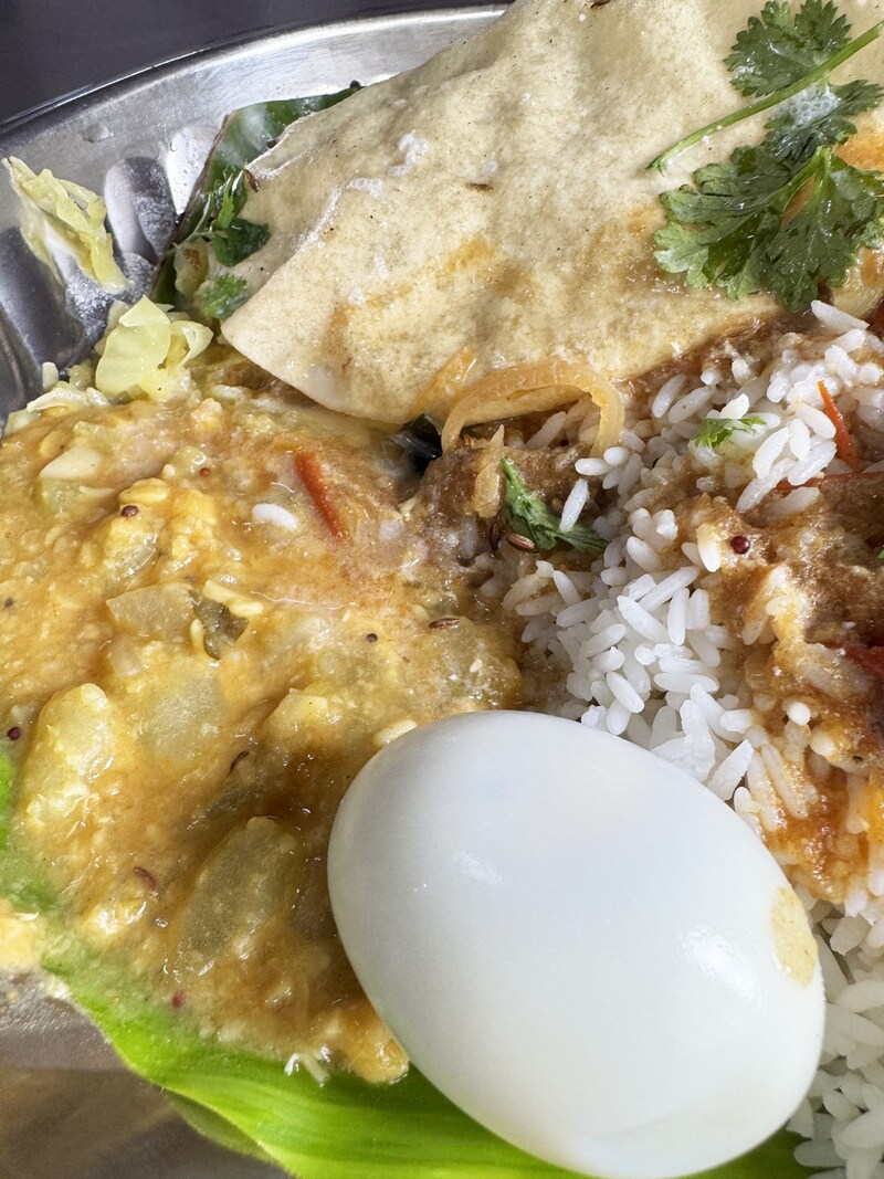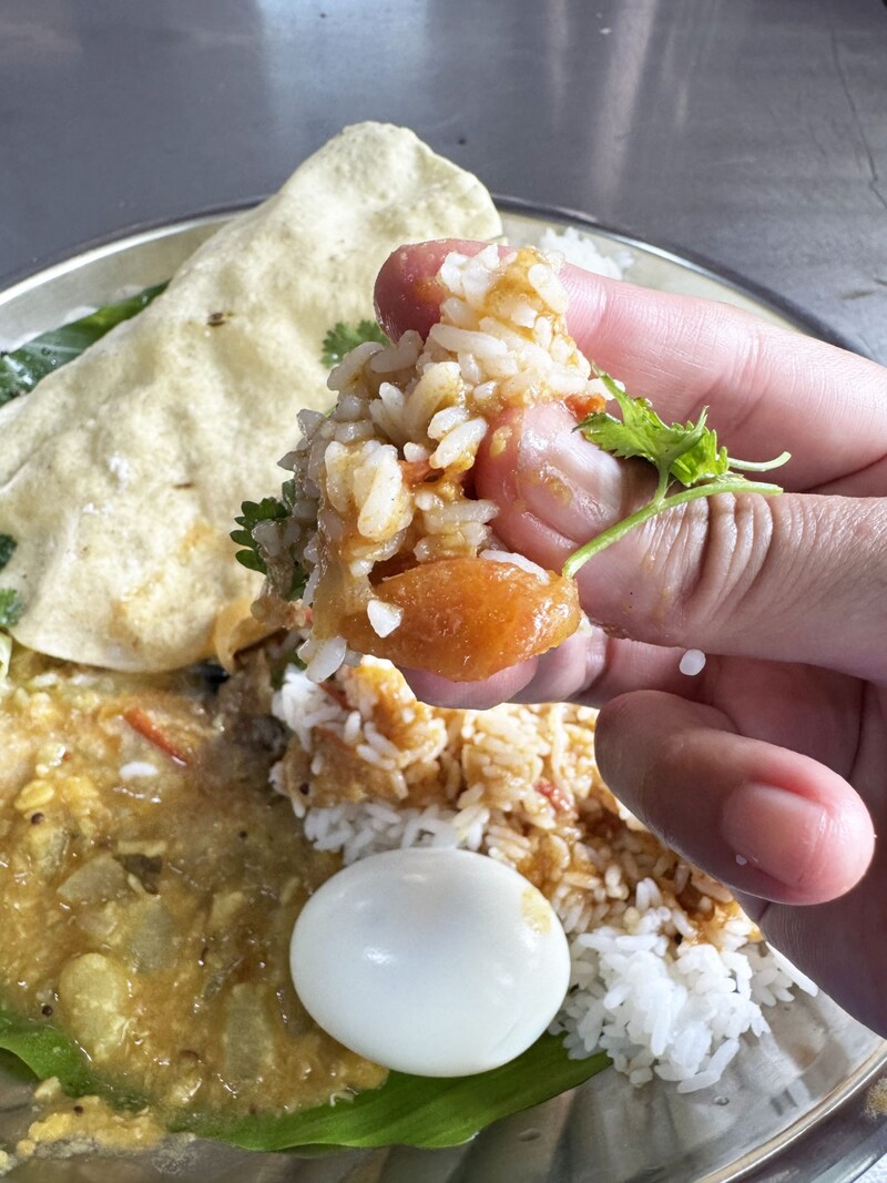 まずはじめに、ライスと根菜カレー、漬物、パパド(インド式せんべい)、ゆで卵が盛られた皿を渡されます。あとは自分でスープ(サンバル)やヨーグルトをお好みでかけます。筆者はかけまくりました。