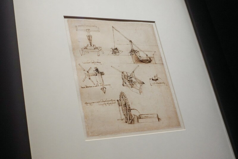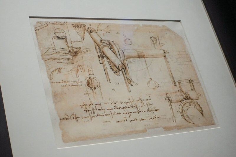 ミラノのアンブロジアーナ図書館館長が“水の都・大阪”にちなんで特別に選んだ、水を汲み上げる装置や油圧ポンプなど、レオナルド・ダ・ヴィンチ自身の筆による「水」にまつわる紙葉2点が展示されています。さらに、すべての文字が右から左へ書かれた“鏡文字”になっているのも見どころのひとつ。会場では、左利きだったレオナルドならではの筆跡にぜひ注目してみてください。