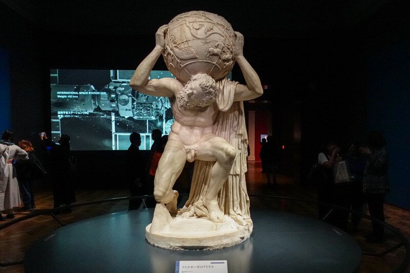 紀元150年頃に制作された作品で、高さ193cm、重さ約2トンの大理石像は、迫力たっぷり。ギリシャ神話の巨神アトラスが支える天球儀は、現存する最古のものとされ、42の星座に加えて、地球の赤道を投影した「天の赤道」などの天文学上の基準線が驚くほど精密に刻まれています。