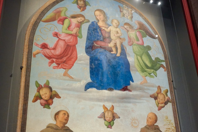 2段構成の本作は、上部に聖母子と天使たちが穏やかに見守る“天上の世界”が描かれています。なかでも注目は、聖母のそばに描かれた天使たち。実は“顔だけで描かれた天使”のほうが、全身を描いた天使よりも高位の存在なのだそう。一方、下部にはアッシジの聖フランチェスコとシエナの聖ベルナルディーノが、信者たちとともに祈りを捧げる姿が描かれ、背景には、塔や城壁、宮殿など、当時のペルージャの街並みが精緻に再現されています。