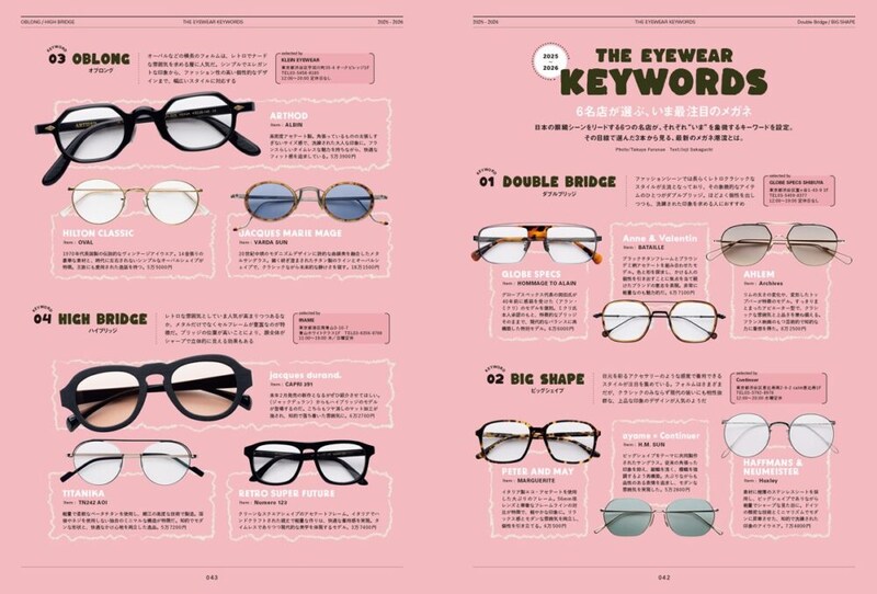 日本を代表する6つのメガネ店が、それぞれ“いま“を象徴するキーワードを提案。各店の審美眼で選んだ3本を通して、2025年のメガネトレンドを読み解きます。そのほか、ブランド直営店の登場や老舗の移転など、新たな動きが絶えない渋谷界隈のメガネ店マップや、セルロイド素材にこだわった「カーニー」のデザイナーインタビューを収録しました。