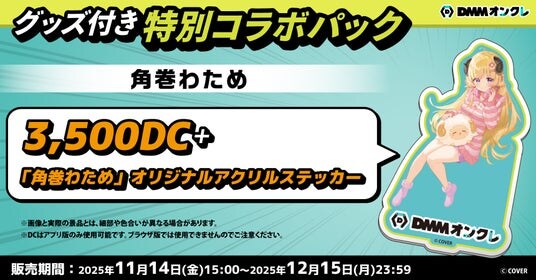 DMMオンクレのプレイに必要なDC(3,500DC)に、DMMオンクレ限定デザインの「アクリルステッカー」がセットになったお得なDCパックを販売します。