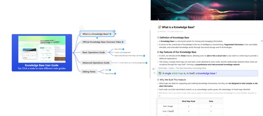 左にマインドマップ、右にノートを配置した分割ビューで、発想と記録を同時に行うことができます。マインドマップで情報を構造化しながら、ノートに詳細を記録・保存することで、思考の流れをスムーズに可視化できます。