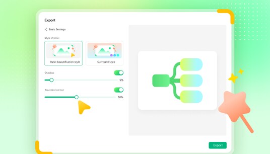 スタイル付きエクスポート機能が新しく搭載され、影や角丸などがついたエクスポート設定に対応しました。SNS投稿やプレゼン資料など、あらゆるシーンに最適です。
