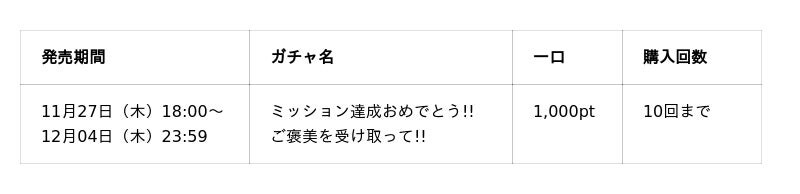 ※達成報酬を受け取れなかった場合でも、全てのミッションが達成されていれば、ご褒美ガチャの対象となります。
