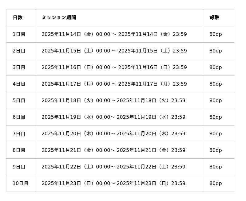 ※対象ミッション達成時に付与される報酬「80dp」は即時反映されます。