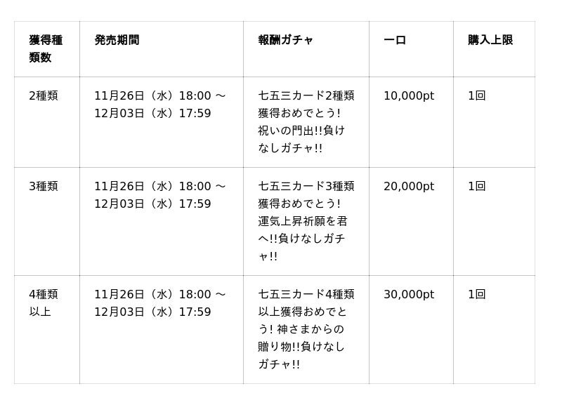 キャンペーン期間中、対象ガチャや購入条件付きの特別ガチャで「七五三カード」を集めるイベントを開催。