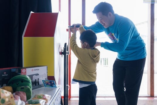 ドローンを操作し、設定されたコースをクリアして得点を獲得。スコアに応じて景品がグレードアップするゲーム性を取り入れ、操作を通して集中力・空間認識力・挑戦心を育みます。終了後はドローンと一緒に記念撮影も可能です。