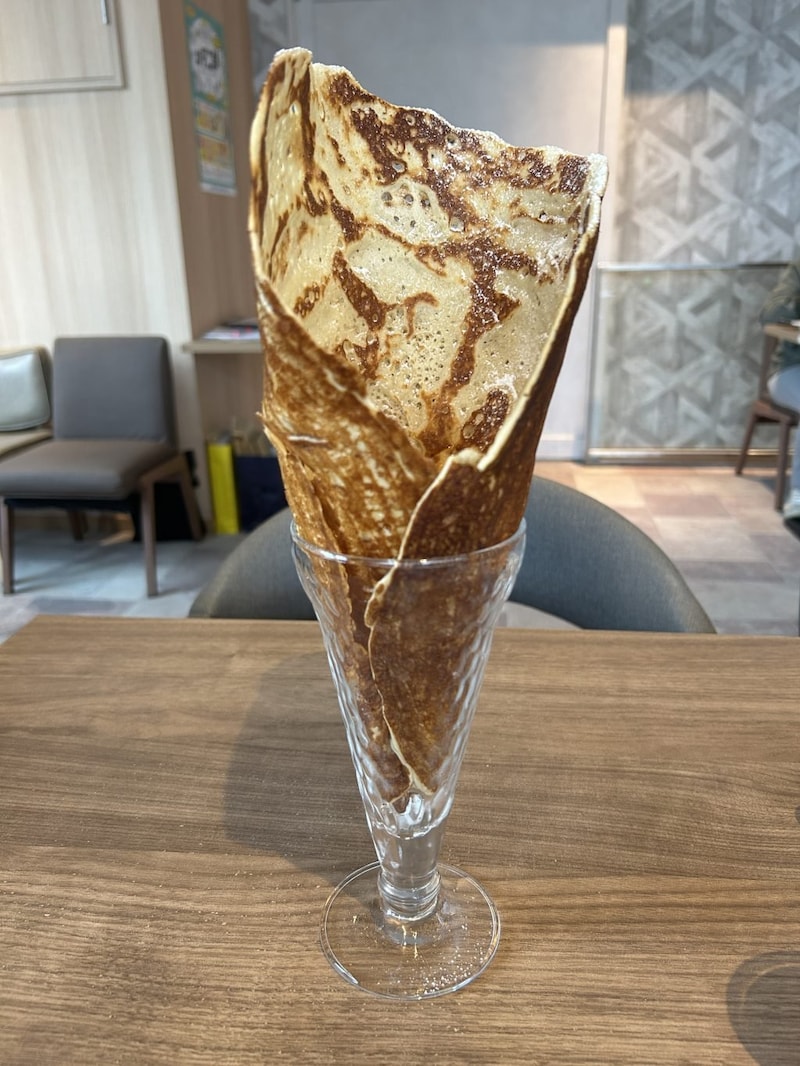 直径の大きいクレープが“1枚まるごと”どーーーん! 一口食べると、外はパリッと香ばしく、中はもちっとした食感です。