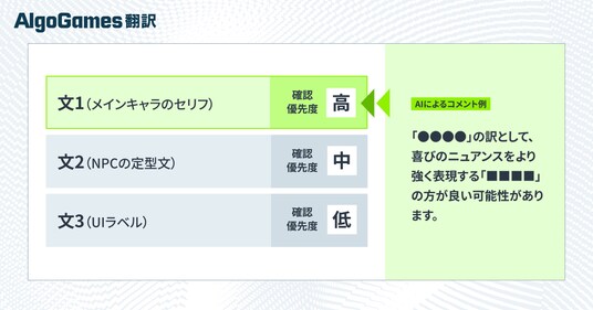 『AlgoGames 翻訳』では、AIが翻訳を行うだけでなく、自ら「確認優先度」「その理由」「別訳案」を提示します。この「AI申し送り」により、プロ翻訳家は翻訳の要点を即座に把握し、修正の要否や改善方針の判断をスピーディーに行うことが可能となります。