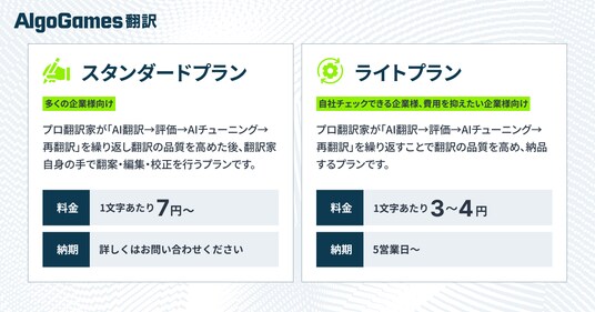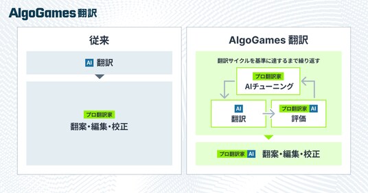 『AlgoGames 翻訳』では、独自のAI技術により、AIとプロ翻訳家が互いに業務を補完し合うことで効率化するハイブリッド方式を構築しています。プロ翻訳家がAIの評価・チューニングを繰り返すことで一次翻訳の質を大幅に改善し、さらに独自技術を用いたAIシステムが翻案・編集・校正を補助することで工数を大きく削減。プロ翻訳家による高い品質を保ちつつ、従来と比べ価格を抑えて翻訳を提供することが可能になりました。