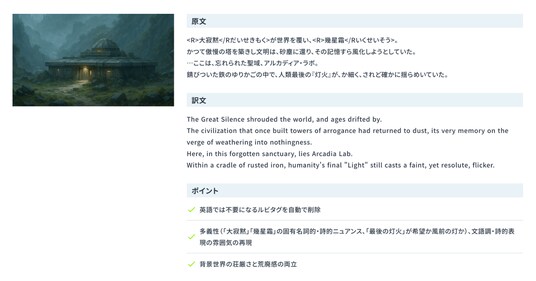 - 作品単位のチューニング:キャラクター設定や舞台背景、用語、シーン間の関係性などを構造化し、各作品専用の翻訳AIエージェントを構築します。