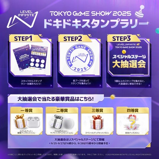 Level Infiniteブース内にて写真撮影を行い「#LITGS2025」のハッシュタグを付けた上で、ご自身のSNSアカウントに投稿。投稿済画面をインフォメーションスタッフにご提示いただくと、グッズをプレゼントいたします。