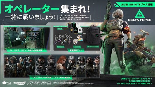 さらに、来場者には多彩なプレゼントをご用意しています。来場者全員に、『Delta Force』オリジナルグッズセットをプレゼントします。試遊参加者にはさらにステッカーをプレゼント。また公式Xアカウントをフォローし、指定ハッシュタグ「#デルタフォースTGS」と「#DFTGS集結」を付けて画像投稿(例:コスプレイヤーとの記念写真など)すると、キーホルター・お守り・タクティカルバッグなどをランダムで入手できる抽選会に参加できます!ぜひ、Level Infiniteブースにお越しください!