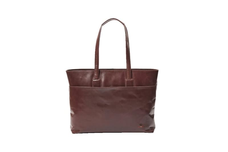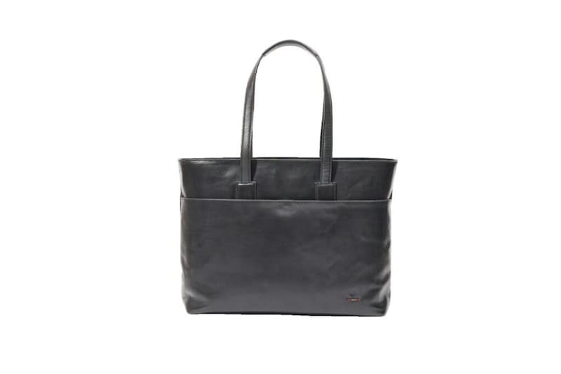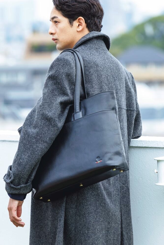 程よい光沢のあるカウレザーを贅沢に使用した収容力抜群のトートバッグ。A3サイズの収容が可能で、PCなどの電子機器、ライトアウターも入れられる。ハンドルがやや長めに設計されているため、手持ちだけでなく肩にかけて使用できる点もデイリーユースにおいて嬉しいポイントだ。外側ハンドル下に配置されたポケットや内部の仕切りなど、随所に機能的なディテールが。3万5200円