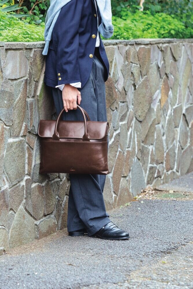 モデル名の通り、ビジネスシーンを想定した手持ちバッグ。スーツスタイルとの相性は言わずもがな、紺ブレやツイードジャケットなどを軸としたジャケパンスタイルともマッチする。フラップとファスナーの二段階構造になっており、セキュリティも◎。手持ちに適したハンドルの長さやフラップ部分のレザーのカッティングなど、細かなところに気が利いたデザイン美が光る。3万6300円