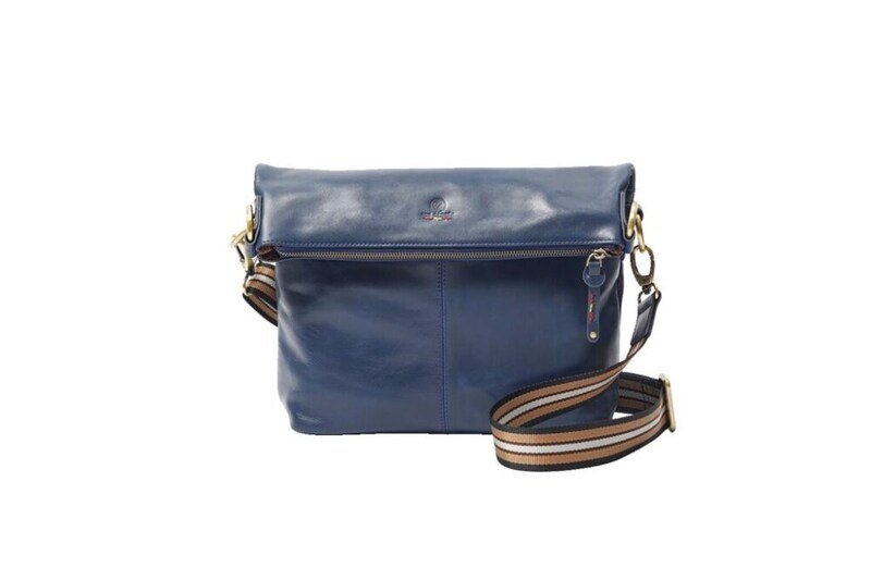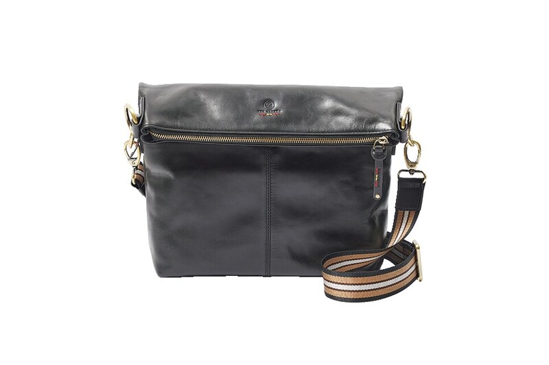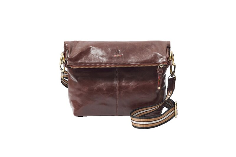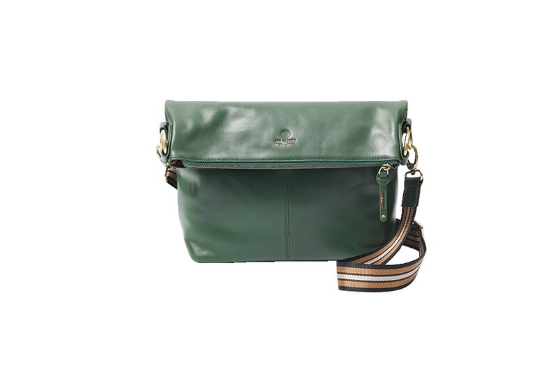 ちょっとした外出に最適なサイズのショルダーバッグ。写真のように折りたたんで使用すれば横型、折り畳まずに上部のリングにショルダーベルトを通せば縦型と、ひとつのバッグでふた通りの持ち方を楽しむことができる。アメリカントラッドを思わせる、レジメンタルタイのようなショルダーベルトのカラーリングはコーディネイトのアクセントとしてもひと役買うこと間違いなし。2万4200円