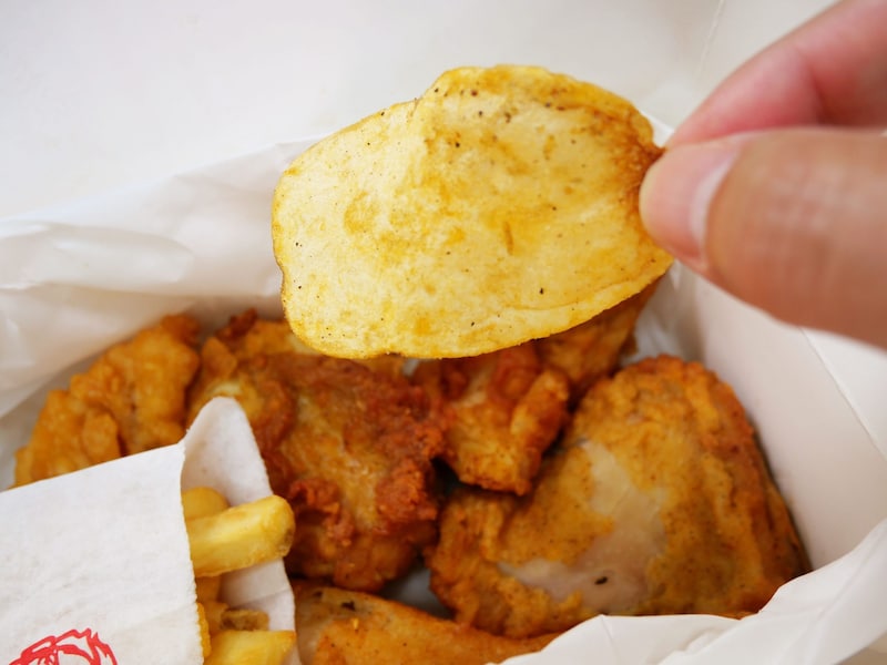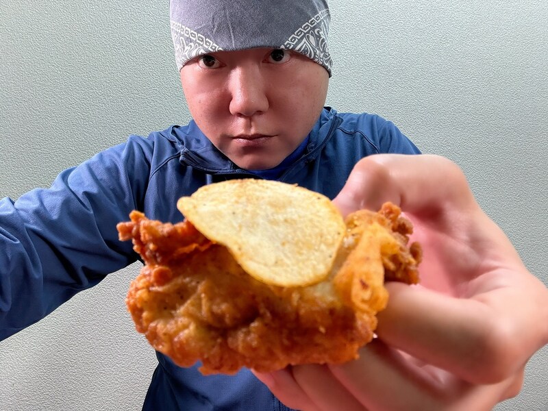 ケンタキにケンタキ味のポテトチップスをのせて食べたところ、かなりディープな濃さのスパイス感あふれる味にメガ進化。いつも以上に濃いケンタキ、良き。