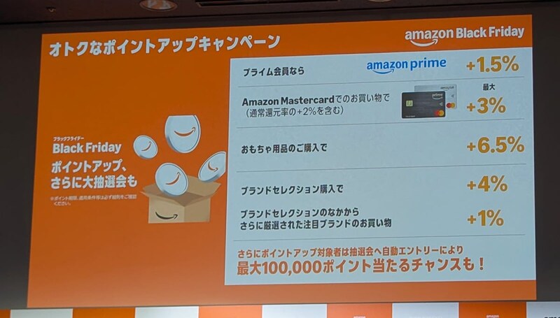 おトクにポイントを稼ぐポイントアップキャンペーンを実施。12月1日23時59分までのエントリー期間中にエントリーのうえ、11月21日0時~12月1日23時59分の対象期間に合計1万円以上の注文をすることでポイントアップの対象になります。還元率はプライム会員ならプラス1.5%、Amazon Mastercardによる購入でプライム会員はプラス最大3%、おもちゃ用品の購入でプラス6.5%、「ブランドセレクション」として販売される商品の購入でプラス4%、ブランドセレクションの中からさらに厳選された注目ブランドの買い物でプラス1%。さらに、ポイントアップ対象者が自動でエントリ―される抽選会で最大10万ポイントが当たります。