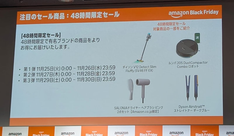 開催期間中、有名ブランドの商品をお得に購入できる「48時間限定セール」を実施。ダイソンのスティック掃除機「V12 Detect Slim Fluffy」、ルンバのロボット掃除機「205 DustCompactor Combo ロボット」などが対象商品として発表されています。開催日時は下記のとおり。
