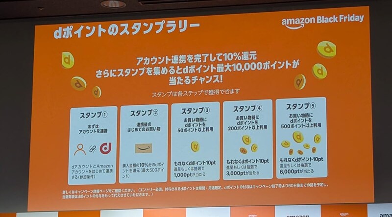 12月1日23時59分までにエントリ―後、dアカウントとAmazonアカウントを連携したうえで購入時にdポイントを利用すると、利用ポイントに応じて抽選で最大1万ポイントが当たる「dポイント スタンプラリー」も実施します。