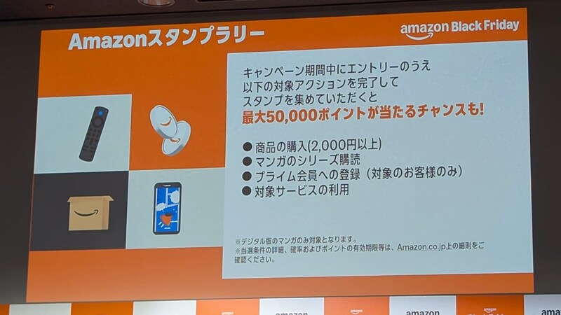 12月4日23時59分までの期間中、キャンペーンページにエントリ―のうえ「2000円以上の商品の購入」「マンガのシリーズ購読」「プライム会員への登録」「対象サービスの利用」のアクションを完了してスタンプを集めると、最大5万ポイントが当たる「Amazonスタンプラリー」を実施。