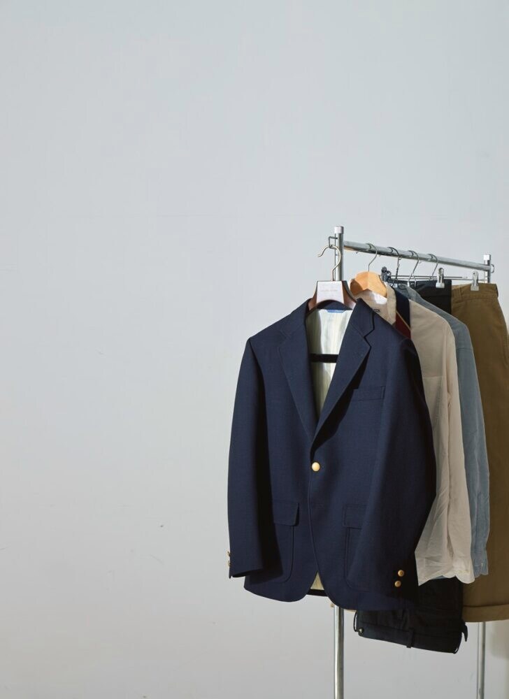 店頭でのオーダーを経て、おすぎ村のこだわりが随所にみられる紺ブレが完成。折角なので、仕上がったブレザーを軸に4つのコーディネイトを組んでみた。