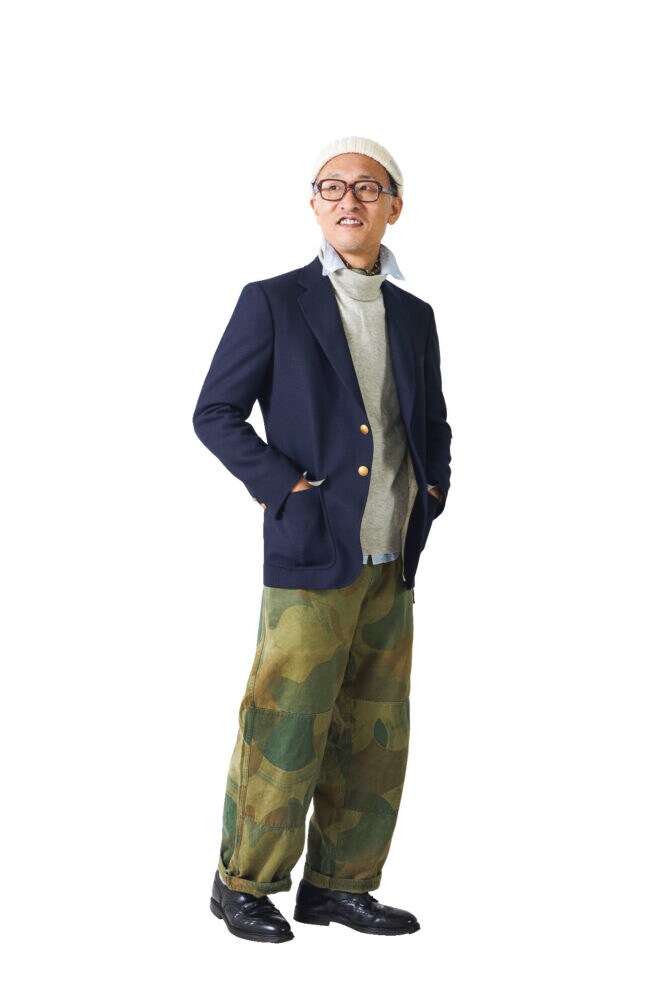 数年前から本誌が提唱する、ベーシックなトラッドに武骨なミリタリーアイテム組み合わる“ミリタリートラッド”。「ウエストシェイプの効いた美しいシルエットなど、ドレッシーな要素も併せ持つブレザーだからこそ、存在感のあるカモ柄の軍パンとのコントラストが際立ちますね」