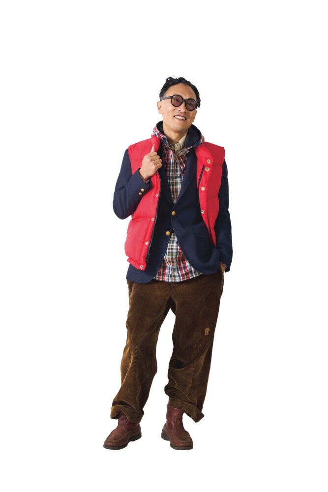 機能性に優れるアウトドアアイテムを組み合わせる“アウトドアトラッド” とも紺ブレは好相性。「こちらも2ndらしい、トラッドを着崩した装いです。ブレザーにダウンベストを重ねるのは難易度が高く感じますが、