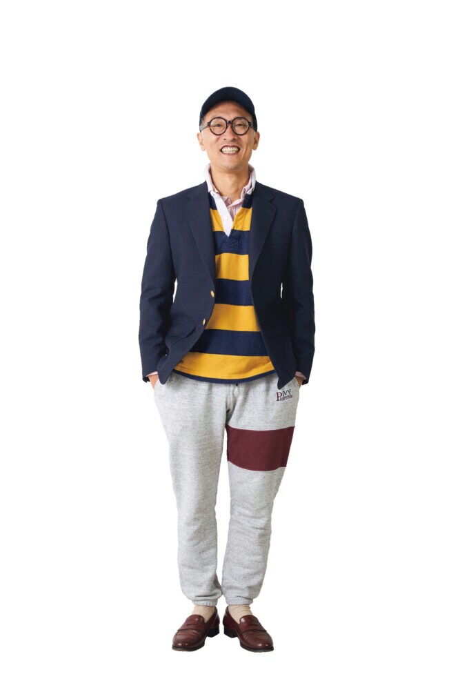 アイビーから派生し、正当なアイテムを使って着崩すのがプレッピーの真髄。「ラグビーシャツ、スウェットパンツのようなスポーティなアイテムも仕立ての良いブレザーを羽織れば、品のある装いになります。休
