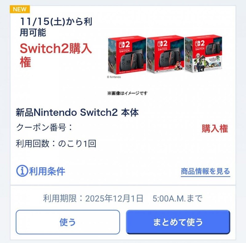 条件を満たした人は、ゲオアプリで「Nintendo Switch 2 購入権」クーポンが配布されます。配布日は11月14日、利用期間は15日から30日までです。