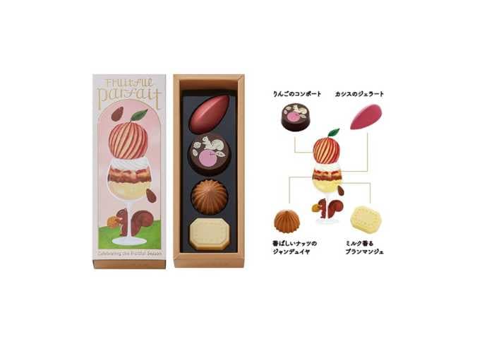 果実園で過ごす動物たちの物語を、4つの異なるパルフェで表現したシリーズ。白ぶどう、いちご、シトラス、りんごの果実感をチョコレート層で繊細に表現し、個性的なのにやさしい味わいが楽しめます。