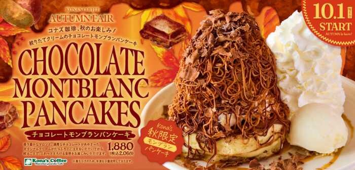 秋が深まる季節にぴったりのスイーツが、ハワイアンカフェ「コナズ珈琲」に登場します。2025年10月1日(水)から全国で発売される「チョコレートモンブランパンケーキ」は、香り豊かなマロンペーストと濃厚なチョコレートガナッシュのダブルクリーム仕立て。さらにホイップクリームやココナッツアイスを添えて、見た目も味わいも贅沢に。秋限定ならではの甘美なパンケーキで、ハワイ気分と至福のひとときを楽しんでみて♡