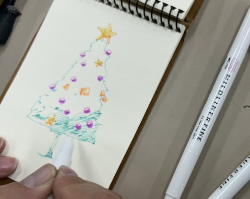 クリスマスツリーのオーナメントを描き込み、華やかさをプラス。細字と極細を使い分けることで、シンプルなイラストにも奥行きが生まれます。