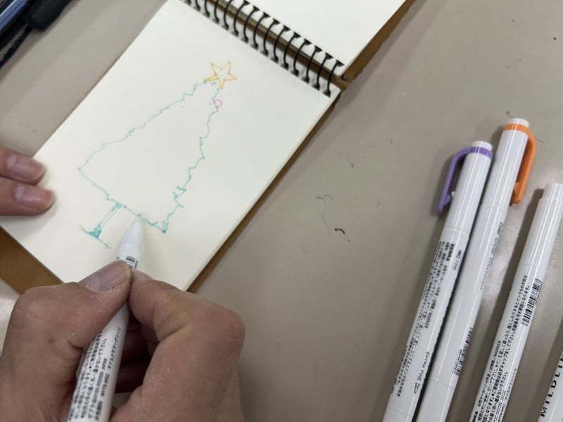 さらに、ツリーの木の部分には、同系色の細字と極細字を重ねるように描いていくことで、立体的な陰影を表現。色の濃淡や線の強弱を活かすことで、イラストに深みが加わります。