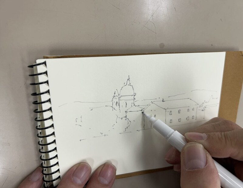 『マイルドライナーファイン』Bセットのクリスマスイラストに続き、小林聡一先生には『マイルドライナーファイン』Aセットで風景画を試していただきました。風景画やペン画の講師としても活動されている先生ならではの目線で、Aセットの使い心地を確かめていただきました。
